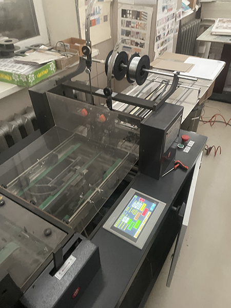 Брощюровщик на скобу (две головы Хохнер), очень хорошая машина, шьет блок проволокой, далее фальцует, обжимает, и подрезает, удобная настройка, машина очень хорошая в работе, без заморочек как хорайзен, минимум электроники. Работает без сбоев не капризная. Можно делать изделия А4, А5 на двух скобах и А6 на одной скобе. К нему есть подборщик Тайсон Бониц, на нем подбирали блок с обложкой, если надо отдадим и его. На производстве, можно посмотреть и потестить.