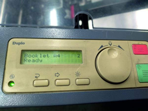 Duplo DBM-120 — автоматический буклетмейкер (степлер-фальцовщик), выполняет фальцовку блока листов (сгиб) и его скрепление металлическими скобами. Рабочий формат от 200х200 до 320х450 мм . 2 рабочие головы с кассетами по 5000 скоб.Габариты ДхШхВ 1250х550х650 мм.Вес 112 кг
