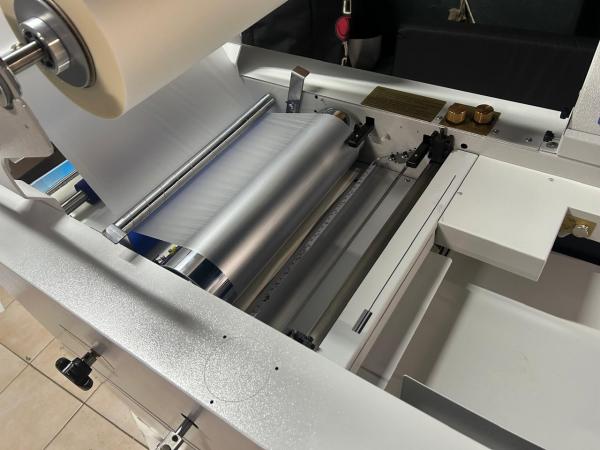 Ламинатор оборудован секцией надсечки и надрезки пленки. Держатель оснащен креплениями под 2 рулона,для быстрой переналадки машины под работы на другой пленке, втулки под 1 и 3х дюймовую шпулю.