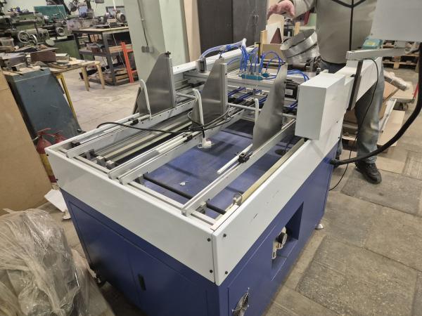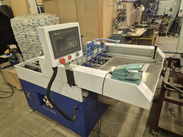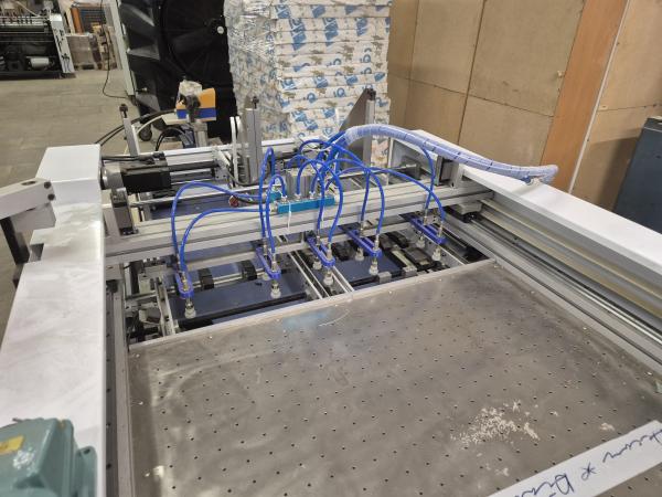 Самонаклад, для позиционирования сторонок переплетной крышки. Формат 650/400 мм. Привод намсерводвигателях, контроллер Тайвань дельта. Возможность наклада до 5 сторонок. Скорость до 16 циклов в минут.