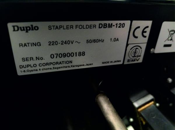 Duplo DBM-120 — автоматический буклетмейкер (степлер-фальцовщик), выполняет фальцовку блока листов (сгиб) и его скрепление металлическими скобами. Рабочий формат от 200х200 до 320х450 мм . 2 рабочие головы с кассетами по 5000 скоб.Габариты ДхШхВ 1250х550х650 мм.Вес 112 кг