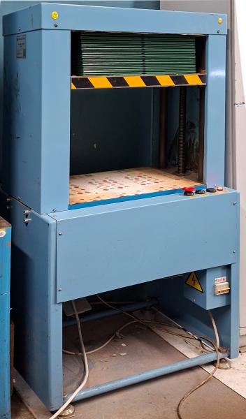 Двухпозиционная конструкция (подвижная плита между двумя неподвижными) позволяет работать без пауз: пока одна партия книг находится под давлением, оператор загружает следующую стопу во вторую секцию. Это значительно увеличивает производительность труда.